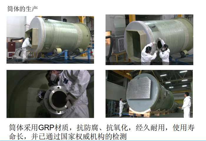 一體化污水泵站是生活、市政雨污水為一體的預制提升泵站。復合纏繞玻璃鋼筒體為主體,內設潛污泵、自動耦合裝置、管道、閥門、控制系統、爬梯、維修平臺等,進水口加設提籃格柵或粉碎型格柵,筒體上設有玻璃鋼頂蓋,是把所有設備及儀表集成在一起的成套設備。